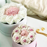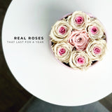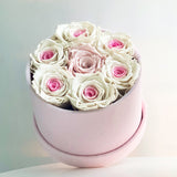 Meticulously prepared, arranged and packaged, the roses in Blush can retain their beauty for over a year.